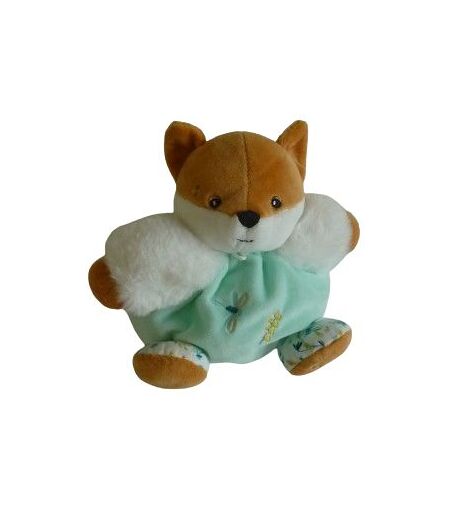 Doudou peluche musicale renard 20 cm environ, vert blanc marron motif libellule. Etat : Comme neuf ...