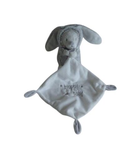Doudou peluche ours déguisé en lapin 17 cm environ sans compter les oreilles gris blanc, mouchoir blanc gris : 18x18 cm environ Happy Baby brodé. Etat : Comme neuf ...