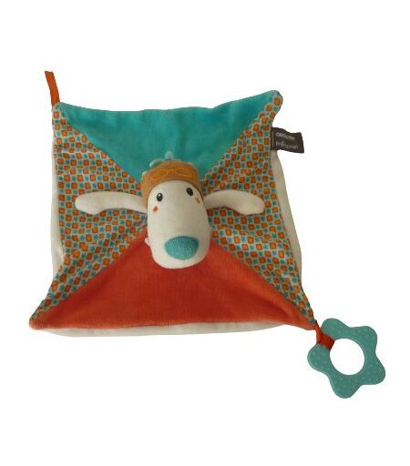 Doudou plat chien 25x25 cm environ, anneau de dentition, turquoise orange blanc motifs. Etat : Très bon état ...