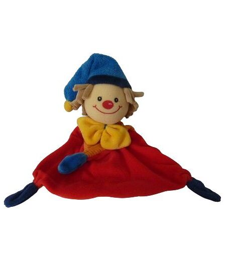 Doudou plat clown 27 cm environ, grelot, rouge bleu jaune rayures. Etat : Comme neuf ...