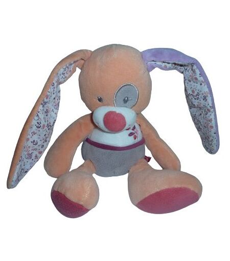 Doudou peluche lapin 24 cm environ sans les oreilles, orange rouge violet motif fleurs. Etat : Comme neuf. DOUDOU DIFFICILE A TROUVER ...