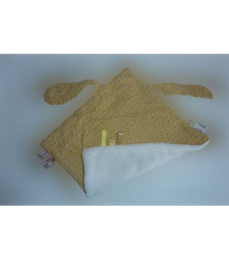 Doudou carré plat 26x26 cm environ, 2 grandes oreilles, blanc moutarde à motifs. Etat : Comme neuf (plus l'étiquette de la marque). DOUDOU DIFFICILE A TROUVER ...