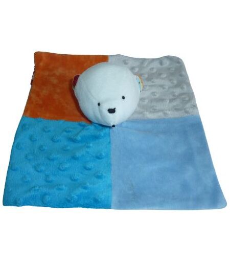 Doudou plat ours 24x24 cm environ, bleu orange marron, verso : imprimé dinosaure. Etat : Bon état (plus l'étiquette de la marque). DOUDOU DIFFICILE A TROUVER ...