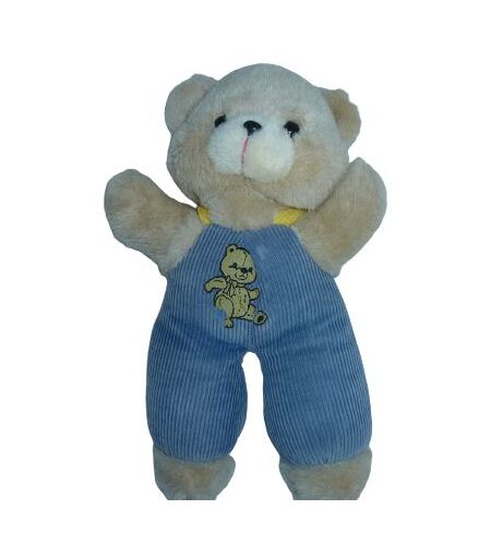 Doudou peluche ours ancien 35 cm environ, marron en salopette bleu motif ours. Etat : Bon état général (manque du motif et un peu d'usure sur le haut de la salopette). DOUDOU DIFFICILE A TROUVER ...