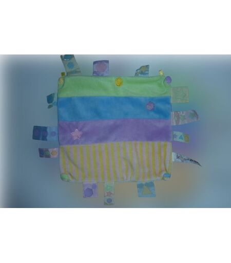 Doudou carré plat bordé d'étiquettes 20x20 cm environ, couleurs pastels. Etat : Très bon état. DOUDOU DIFFICILE A TROUVER ...