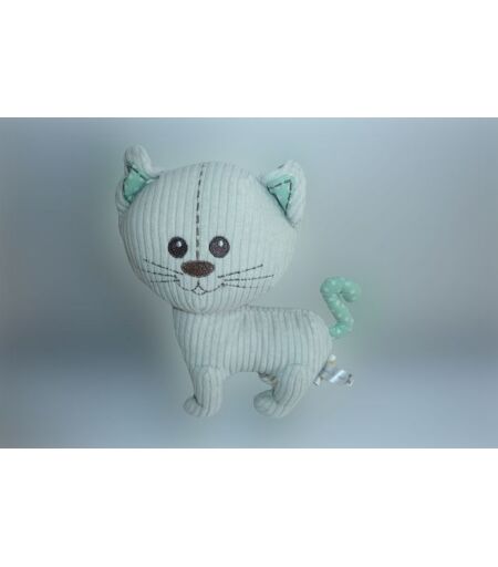 Doudou peluche chat 21 cm environ de hauteur, gris clair vert motif pois. Etat : Comme neuf ...