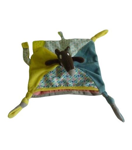 Doudou plat loup 25x25 cm environ, attache tétine, anneau dentition, 4 nouages, multicolore. Etat : Très bon état (attache tétine adhère moins) ...