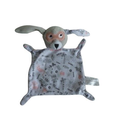 Doudou plat lapin 23 cm environ, gris blanc motifs divers. Etat : Comme neuf ...