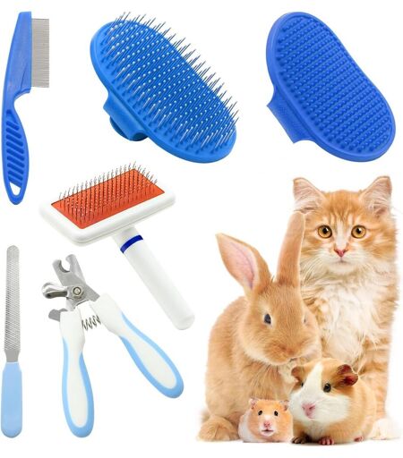 Small Pet Grooming Tool Set:Contains 1 x Straightening Brush with Protective Tips, 1 x Stainless Steel Needle Comb, 1 x Stainless Steel Needle Glove Brush, 1 x Rubber Tip Glove Brush, 1 x Nail Clippers and File. The pet grooming kit is safe and effective and promotes a natural shine for your pet.Pet Grooming Brushes: reduce shedding and prevent hairballs. Our grooming comb with stainless steel needles is ideal for removing carpets and finer hair. This could be a useful entry-level gift for the new pet owner.Regular Pet Brushing: Regular brushing helps keep the coat in good condition and helps prevent hairballs and nail ornaments from keeping your pet's feet healthy and not clinging to the mat.Bond between you and your pets: grooming your rabbit or small animal helps get rid of excess coat, gives you the ability to connect with your pet, and allows you to check for early signs of possible health problems.APPROVED SMALL PET Grooming Brush Set:It is also the perfect tool for grooming guinea pigs, chinchillas, rats, ferrets, kittens, dogs, cats. Tips: Shorthair rabbit breeds should be kept at least once a week, more frequently during dandruff. Long-haired breeds should ideally be looked after every day, especially if they fall out. Long-haired rabbit breeds tend to develop carpets if their coat is not kept in good condition due to regular grooming. ...