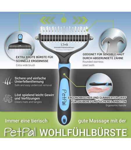 ¿ No More Nerve Hair - 5 minutes is enough to effectively remove large amounts of loose undercoat. Let yourself be surprised by how much dead undercoat you take out with this brush. Ideal for medium to long haired dogs and cats.¿ A GOOD ANIMAL MASSAGE - Don't scratch and suffer like some other brushes, there are none here. On the contrary, 17 + 9 precision blades ensure gentle and gentle grooming with optimal results. Unlike traditional brushes with dotted ends, the skin is not irritated. Thanks to the rounded teeth, your dog or cat will love the gentle massage. Also ideal for sensitive skin.¿ SIMPLE AND QUICK - Extra wide design creates a faster result with less stress. The barbels allow you to remove even the deep undercoat. Tangles and knots are easily solved. Does not damage healthy hair. Improve the well-being of your loved one by ridding him of the allergenic undercoat.¿ COMFORTABLE ERGONOMIC HANDLE - The ergonomic handle fits comfortably in the hand. The ergonomic handle is pleasant to the touch and thus ensures comfortable brushing. This prevents premature fatigue.¿ 100% SATISFIED OR REFUND - Your satisfaction is guaranteed! If for some reason you should not absolutely like the brush, just return it within 60 days. Our friendly customer service will refund you the full amount - no strings attached. Put your PetPäl premium dog brush in your basket. ...