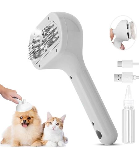 Pet Steam Brush Our pet steam brush has multiple functions, combining to effectively and safely clean the surface of the hair, detangle knotted hair and remove loose hair. It is a practical and simple to use product that will provide a comfortable experience for your pet while increasing the softness and shine of your pet's hair.[One Touch Dehairing Design]All your pets dander and combed dead hair will be collected on the brush. Simply press the hair removal button to easily clean the brush after grooming. One Touch cleaning button saves you time and effort when cleaning. Suitable for short and long haired pets.Anti-Static Pet Brush Our pet steam brush has multiple functions, combining to effectively and safely clean the surface of the hair, detangle knotted hair and remove loose hair. Prevents static electricity and facilitates hair removal. Especially useful in autumn and winter when static hair can be difficult to manage.SUITABLE FOR MANY PETS Whether your pet has long or short hair, large or small, our pet steam brush is an ideal grooming product that will make your pet happy. It is designed that each comb has a circular massage bead to ensure that your pet's skin is not hurt. You can also hang it with a silicone strap after use.Use with Confidence Our pet brush is equipped with a water spray design that gently moistens your pet's hair while combing. The water tank can be used to add water, deodorant or softener for grooming. The ergonomic handle provides a comfortable grip for easy grooming. ...