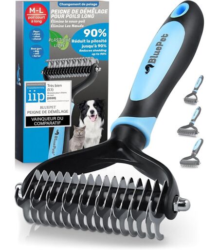 QUICK AND SOFT UNDERHAIR REMOVATION: The rounded teeth of the brush quickly and effectively remove undercoat in dogs and cats, while being gentle on skin and coat. Softer than other brushes thanks to the smooth surfaces inside the detangling comb.Professional detangling for long-haired animals: The professional brush removes dead hair and unlocks the most stubborn knots. The ideal comb for professional grooming for long-haired dogs and cats, such as Maine Coon, Australian Shepherd, Golden Retriever and many more.MULTIFUNCTIONAL BRISTLE BRUSH: The right brush for every use. Coarse 9-blade side removes undercoat and heavily tangled hair. The thinner side, with 17 teeth, smooths bristly hair and eliminates fine knots.Innovative: thanks to the surfaces inside the comb to detangle, the covering hair is not damaged. Help your dog, cat or horse change coat As a dog comb, dog curl, cat brush, cat comb for daily coat care.BLUEPET: Everything you need & 100% satisfaction - With our combs, brushes, strawels, claw scissors and our tick hooks, you can ideally take care of your four-legged companions. ...