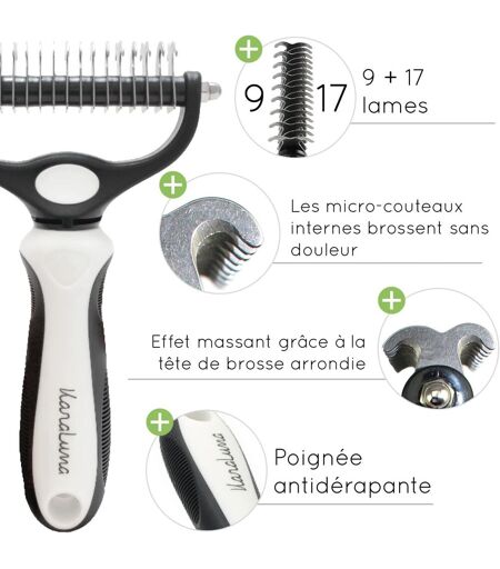 Gentle coat care for your cat or dog - the KaraLuna brush glides gently over your cat or dog's coat thanks to its rounded head. It removes loose and tangled undercoat without pulling or stressing your pet.Unbinds tangled areas - Thanks to the thin blades on the inside, the tangled undercoat is combed effectively and painlessly.Soft on the top coat - The thin blades are gentle on your pet's upper hair. With the KaraLuna undercoat brush, easily detangle hair knots.Effective combing and refining - Extra-large brush head quickly removes loose and tangled undercoat. This dog brush is perfect for long-haired dog breeds such as Australian Shepherds, Labradors, St Bernards or Border Collies.HIGH QUALITY AND PRECISION - The KaraLuna detangling comb has 9 + 17 precision blades. Use the 9-blade grate side for particularly dense and matted coat areas. The 17 blade side is ideal for deep brushing and detangling coat. ...