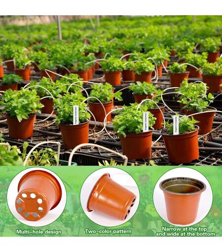 [Inclus dans le produit] : Vous recevrez 100 pot semis + 100 étiquettes de plantes (10*2cm), la taille des pot de fleur plastique est de 10cm de calibre supérieur*6,5cm de diamètre inférieur*8,5cm de hauteur. Cette pot plastique plante est parfaite pour les amateurs de jardinage pour faire pousser des semis et cultiver des plantes succulentes dans les jardins domestiques, les balcons, les serres en verre.[Longue durée d'utilisation] : Le petit godet semis est fabriqué en plastique de haute qualité, léger mais super durable, robuste et durable, d'épaisseur moyenne, pas facile à déformer et à casser, doux, lavable et . Même à l'extérieur, les jardiniere plastique peuvent résister au temps et aux intempéries et rester au soleil pendant des années sans devenir cassantes.[Excellent drainage et facilité de transport] : Les trous de drainage à mailles multiples au fond de ces godets de repiquage offrent une excellente respirabilité et un bon drainage, protégeant la santé du système racinaire et réduisant le problème de la flexion des racines ou de la pourriture. Les pot fleur plastique peuvent retenir l'humidité et la température, ce qui améliore les taux de germination et de survie. Les plantes peuvent être retirées intactes lorsqu'elles sont transplantées à un autre endroit.[Cadeau pour les amoureux du jardinage] : Les pot pour semis au design mat et simple sont d'excellents cadeaux pour les amateurs de jardinage, idéaux pour les anniversaires, noël et pâques.La pot de semis peut faire pousser une variété de plantes vertes ou de fleurs, telles que des succulentes, des semis, des fruits, des légumes, des légumes verts.[Large application] : La pot en plastique convient à de nombreuses saisons de culture et de plantation. La pots pour semis convient pour faire pousser des plantes, planter des graines, faire pousser des semis, des plants de légumes à racines super tendres, des boutures ou des greffons. Vous pouvez l'utiliser pour faire pousser des fleurs, des légumes verts, des fruits ou des légumes, parfaits pour le jardinage, les jardins, les fermes, les vergers et plus encore. Ces pot culture peuvent également être utilisés comme pots décoratifs pour les plantes d'intérieur et d'extérieur, décor idéal pour les plantes d'intérieur. ...