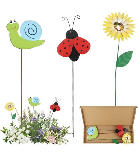 INSECT GARDEN DECORATION - You will receive a set of 3 small insects with unique shapes and bright colors: beetles, snails and bees. Their childlike cartoon inspired design and bright colours will bring vitality and animation to your garden.Sturdy and durable: Outdoor garden decoration made of high quality hard iron, these insects have a weather-resistant surface coating, which protects them from rust and corrosion. They require no maintenance for prolonged outdoor use and are durable.Simple installation: Each outdoor garden decoration is supported by a long iron rod and attaches securely to the lawn, ground or flower bed with a simple attachment. No tools required, easy to use, suitable for various outdoor grounds and beautifies garden corners.RETRO AND COUNTRY STYLE: Combining iron and painted tones, they present a natural and retro beauty, which sharmones with the greenery of the garden. The simple and childish style adds a country atmosphere to your yard.Ideal Gardening Gift:This outdoor garden ornament not only beautify the environment, but also makes a thoughtful gift for family, friends and gardening lovers. Whether for a festival, birthday or housewarming, these little insects will bring warmth and joy ...