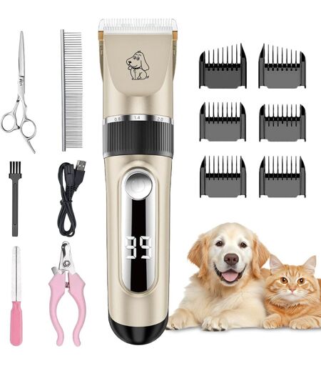 The pet hair clipper is made of high quality materials, with removable titanium ceramic blade to protect your pet from tugging and cutting. Equipped with five different size combs to meet your different needs.Five levels of free adjustment, effective cutting for different lengths and different parts of animal hair.It can be used as a Christmas gift for family members and friends who have pets.USB fast charging port, ultra-efficient and fast, simple and convenient, suitable for all occasions, standby time up to 3 hours, power supply exhausted can also be connected to external power source.Ultra-quiet and minimal vibration can help calm the pet, facilitate the grooming process and no longer see your scared pet.The body can be washed the whole body, the blade can also be removed from the machine and brushed to clean and remove the remaining hairs, reducing the production of bacteria, more clean and hygienic ...