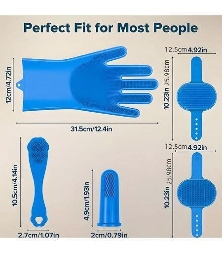 Size: 2 x gloves, 1 x pet toothbrush, 1 x pet foot brush, 2 x pet bristle brushes, a unique solution for bathing, hair removal, massage and grooming.MATERIAL: Made of tear-resistant silicone and with high density bristles for greater durability and use as a brush, scrub brush and massager.Design: Ergonomic, with a perfect adjustable handle that fits different hand sizes, easy to grip and effectively remove pet hair.APPLICATIONS: Deep clean and save shampoo for faster and easier bathing. Multifunctional cleaning gloves for dogs can also remove fur.After-sales Service: We strongly advocate for the rights and interests of consumers; if there is any problem with the product, please give us your feedback in a timely manner. ...