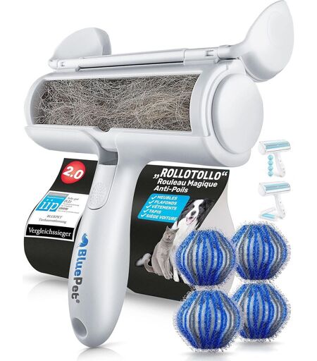 GOODBYE, ANIMAL HAIR: Lint roller, cat hair, dog hair and other animal hair. Reliable and reusable hair remover. Collects pet hair in seconds.Versatile hair removal: The BluePet lint and bristle brush removes pet hair, lint and lint from the fabric sofa, carpets and dog beds. It is also ideal as a upholstery brush for the car.Quick and easy to use: simply move the pet hair brush back and forth repeatedly. The bristles and fluff are thus detached and immediately transported into the container.ECOLOGICAL PET HAIR ROLLER: More effective than adhesive rollers. Eco-friendly and self-cleaning pet hair removal brush. Reusable Lint Roller for Pet Hair, Plush or Lint.INCL. 4 x washing machine balls: The balls ensure the cleanliness of the laundry. Pet hair will cling during washing and drying. For fresh laundry without hair. ...