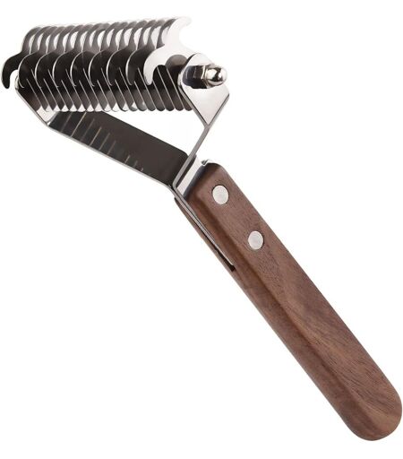 Dog Grooming Rake - Find less hair around your home; By detangling and detangling your pet, the grooming rake helps ensure your pet's coat is healthier; also helps remove undercoat hair while removing tangles.Double Sided Steel Head Rake - With double-sided teeth, the two-way blade has different spacing configurations, 9 teeth for thinning and reducing the veil on one side and 17 teeth on the other for tough mats and tangles. SCRATCH AND PAIN FREE, all blades have polished rounded edges, which eliminates all mats and tangles while being very comfortable on your pet's skin.ERGONOMIC NON-SLIP HANDLE - In addition to improving overall brushing efficiency, our dog rake for undercoat and long hair provides more optimal control thanks to a lightweight, non-slip handle that works comfortably in both hands.Specially Designed for Long Haired Breeds - This premium pet grooming tool is ideal for long-haired dogs, such as Golden Retrievers, as the smooth edges protect the skin while brushing and help reduce shedding by up to 90%.Ideal gift for all pet lovers: our grooming rake is a versatile grooming tool, a must have accessory for pet lovers, it will be a great gift choice for any pet lovers, they will love it ...