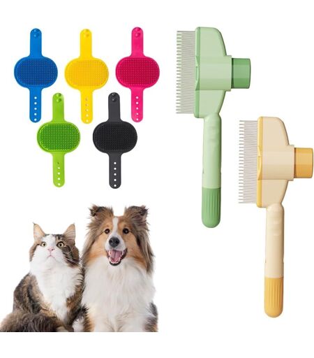 Pet Bath Comb and Brush: This set includes 2 grooming combs and 5 bath brushes, which can easily comb your pet's hair, remove fleas and loose hair, massage and clean your pet's skin, which is an indispensable tool for pet care.Reliable material: The pet comb is made of high quality ABS and the pet bath brush is made of silicone. The brush head is soft and flexible, which can effectively clean the pet's hair while avoiding irritating the pet's skin, for safe and comfortable use.Easy to use: The handle of the comb is ergonomically designed for a comfortable grip, non-slip and non-slip, easy to use whether it is for grooming, flea removal or massage for bathing. Multifunctional silicone pet massage gloves can also be used as table paw rubbing tool to meet your pet's daily needs.Easy to clean: The silicone brush head is easy to clean, just rinse it with water to quickly remove hair and dirt, it is not easy to deform or damage, saving time and effort, maintain hygiene, provide pets with an intimate and long-lasting care experience.Pet Friendly: Whether it is long-haired cats and dogs or short-haired animals, this comb can easily cope with it, help remove loose hair, knotted hair, keep your pet's coat smooth and silky, and at the same time, promote blood circulation, improve your pet's health. ...
