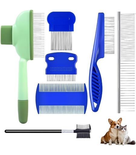 [Flea Remover Tool]This flea comb kit for cats includes a wide-tooth comb, a self-cleaning comb, four fine tooth combs and a dog eye comb. The Fellblitz cat brush effectively removes loose hair, tangles and dirt, for a clean and shiny coat.[Comfortable Handle]The flea comb and tangle comb are lightweight with non-slip handle, providing enough weight for a good grip. They are easy to store and carry. This flea comb for cats and dogs easily removes lice, fleas, phlegm and stains.[Easy Cleaning]This self-cleaning comb has two bristles that effectively remove loose hair from your pet's coat. Simply press the button to remove hair and remove unwanted hair, making grooming simple and easy.[High Quality Materials]Flea combs are made of stainless steel and environmental plastic. Their smooth teeth prevent scratches, are rust-proof and resistant to breakage. Easy to clean and reusable, meet all your pet's grooming needs.[Widely Used]This dog flea comb is suitable for most animals, such as cats, dogs, rabbits and hamsters, whether they have long or short hair. Skin-friendly, it improves blood circulation, massages the skin and provides comfortable grooming for your pet. ...