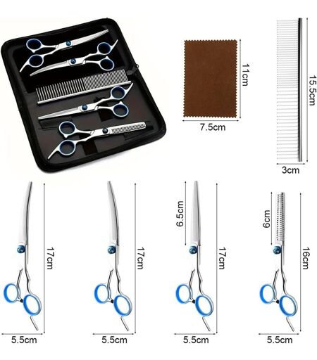 Multifunctional scissor set: professional dog grooming scissors includes flat scissors, curved scissors, dental scissors, small scissors, combs, cleaning cloths and storage boxes, which fully cover all kinds of pet grooming needs and are suitable for daily care and professional cutting.Titanium coated stainless steel material: the dog grooming scissors are made of high quality 4CR stainless steel with a titanium coating, resistant to wear and corrosion. Durable and sharp, they extend their life and are suitable for frequent sizes.Ergonomic design: the cat hair handle is ergonomic and comfortable to hold, reducing hand fatigue after prolonged use and improving cutting efficiency. It is particularly suitable for professional beauticians and pet owners who work for a long time.Flat safety tip: the tip of the grooming scissors adopts a flat design to ensure safety when cutting and is particularly suitable for fine cutting sensitive parts such as the ears and abdomen.Professional cutting experience: each pair of scissors is precision machined to ensure a sharp edge and optimum precision. The tooth scissors are designed to lighten hair evenly, while the curved scissors are suitable for cutting curved areas, offering professional quality results. ...