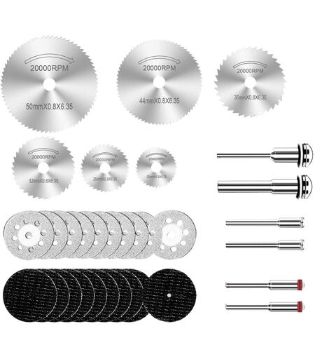 [Complete 3-in-1 Cutting Kit]This set includes 6 HSS blades, 10 diamond discs and 10 resin grinding wheels, ideal for cutting wood, metal, plastic, jade, glass and more¿perfect for all your DIY projects..[Sturdy and Precise HSS Blades]Made of high-speed steel, the 22-50mm circular blades provide a clean and efficient cut on a variety of materials including wood, light alloys and plastics..[Diamond Discs for Hard Materials]Diamond grinding wheels ensure precise cutting of gems, glass or jade with excellent durability and stable performance, even under heavy use..[Low Heat Resin Discs]Designed to produce low heating, these thin discs are ideal for metal, circuit boards or thin chassis. Compatible with electric drills and mini rotary tools..[SATISFACTION ASSURED & REACTIVE SUPPORT]Enjoy reliable customer service: replacement or refund if you have any worries. Buy with confidence, our priority is your complete satisfaction. ...