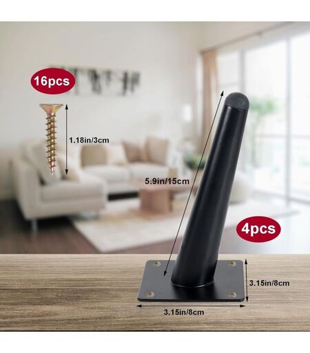 STYLISH DESIGN - Our slanted furniture legs give your sofa a modern and elegant look. With a clean and modern design, they blend perfectly with any interior style and add a touch of elegance to your living room.HIGH QUALITY MATERIALS: Contains 4 x 15cm sofa legs + 16 x screws. Made of high quality cold rolled steel, durable and stable. They provide a solid base and reliable support for your sofa.EASY INSTALLATION - Assembling our angled leg legs is a breeze. With the included mounting accessories, you can easily attach your legs to the sofa. No complex tools or expertise required. Easily transform your sofa in no time.NON-SLIP & SCRATCH RESISTANT - The bottom of our sofa legs are designed to be non-slip and scratch resistant, which protects your floor from damage. Whether hardwood floors, tiles or carpets, our feet provide reliable support and prevent scratches or shifting.Versatility: Our reclining leg sofa legs are not only suitable for sofas, but also for beds, cabinets, dressers and other furniture. Give your furniture a new look and improve its stability and functionality. ...