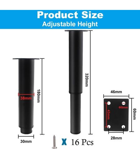 Premium Material The furniture legs are made of high-quality iron, which is not only resistant to corrosion and wear, but also hard and resistant to deformation. In addition, the plastic bases have been thick to ensure sturdiness and durability.EXCELLENT LOAD CAPACITY - Thanks to the mounting plate and the tube wall thickness of about 2.5 mm and 1.2 mm respectively, the four legs of the table can bear a weight of about 400 kg, thus ensuring an excellent load capacity.Adjustable Height - The height of each table leg is 180mm, with an ideal height adjustment range of 0-140mm, which can be accurately adjusted to the desired height, while the height of the table legs can affect the load capacity.Precise Design The thick mounting plate is equipped with four holes for positioning screws for more stable fixing and reducing the likelihood of sinking. In addition, the thick base pads protect the base plate from scratches and reduce noise.Wide Application Height adjustable metal legs can be used for a wide range of furniture, including tables, sofas, wardrobes, closets, closets, storage rooms, etc.Its modern and minimalist appearance is also perfect for home and office. ...