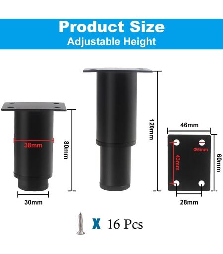 Premium Material The furniture legs are made of high-quality iron, which is not only resistant to corrosion and wear, but also hard and resistant to deformation. In addition, the plastic bases have been thick to ensure sturdiness and durability.EXCELLENT LOAD CAPACITY - Thanks to the mounting plate and the tube wall thickness of about 2.5 mm and 1.2 mm respectively, the four legs of the table can bear a weight of about 400 kg, thus ensuring an excellent load capacity.Adjustable Height - The height of each table leg is 80mm, with an ideal height adjustment range of 0-40mm, which can be accurately adjusted to the desired height, while the height of the table legs can affect the load capacity.Precise Design The thick mounting plate is equipped with four holes for positioning screws for more stable fixing and reducing the likelihood of sinking. In addition, the thick base pads protect the base plate from scratches and reduce noise.Wide Application Height adjustable metal legs can be used for a wide range of furniture, including tables, sofas, wardrobes, closets, closets, storage rooms, etc.Its modern and minimalist appearance is also perfect for home and office. ...