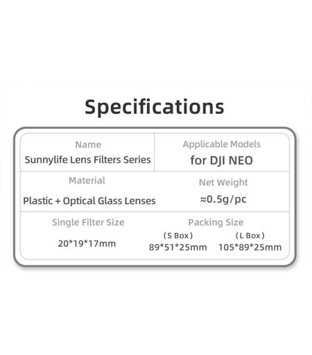 Specially designed filter for DJI NEO drones. Meets the requirements of most weather and light conditions. It is a great tool for your photographic creation.Clear image. Professional German imported optical glass lenses, excellent lens sanding process, good physical and chemical properties make the image clearer, so your work is more professional.- High recovery. Multi-layer filters, high light transmittance and high brightness restore true colors while being waterproof, oil-resistant and scratch-resistant, which can effectively protect the lens.- Does not affect the use of the lens cap.Easy to install, attach the camera, place the filter on the camera, press down slightly, listen to the sound ""click"", it means it is installed.- Lightweight filters. Single net weight about 0.5g, do not increase the load of the gimbal, can be perfectly matched to the gimbal, does not affect the flight. ...