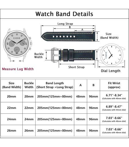 [Crazy Horse Leather]EACHE vintage leather watch strap, upper leather: crazy horse leather, bottom leather: soft and smooth calf leather. Serafil brand sewing thread from Germany, brushed stainless steel buckle. Leather may have some color difference, it is the natural character of leather. Please kindly note.[Classic Thick Design]This leather watch band is a STRAIGHT strap, buckle size = band size, and its THICK watch straps, thickness is about 4mm, can fit all THICK watches whose watch lug size is 20mm. (IT IS NOT AVAILABLE FOR THIN WATCHES).[Select the appropriate size]Before buying, please measure the width of your watch lug first, choosing the appropriate width of watch bands for your watch is very important.[Fit Wrist]This is a straight watch band, thickness about 4mm. The 20mm leather watch strap uses a 20mm buckle, the length of the watch band is 80mm * 125mm (without buckle), it is available for wrist length from 6.71"" to 8.34"" approximately. More color choices, meet your different demands.[Accessories & Service]You will get a watch band * 1 + spring bars * 4 + removal tool * 1, the tool can help you install watch bands or change buckles.If you have any questions, please contact us directly and we will reply within 24 hours. ...