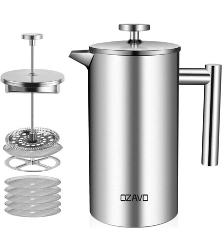 3 en 1 Multifonction : French Press+Filtre à Thé+Mousseur à Lait Manual, 3 en 1 Cafetière à Piston satisfait vos besoin d'un tasse de café ou thé.Double-couche Acier Inoxydable : L'isolement thermique du cafetière piston inox protége de se brûler, et sa conductivité thermique est plus rapide que celle du verre, il n'est pas neccessaire de le faire chaud. Ajoutez des glaçons dans la tasse et versez le café parfumé, parfait pour l'été.Grande Capacité : Capacité de 1 000 ml, 5 filtres de remplacement supplémentaires pour utilisations diverses. Si nécessaire, ils sont faciles à remplacer avec le filtre pré-assemblé. Choisissez deux filtres pour la préparation du café ou un filtre pour le thé en feuilles, le thé au jasmin ou pour d¿autres.Facile à Nettoyer : La cafetière inox avec filtre et couvercle sont amovibles et toutes les pièces sont faciles à démonter.La cafetière OZAVO est facile à utiliser et peut extraire entièrement l¿essence du café et conserver la riche saveur d¿origine. Filtre métallique, durable et facile à nettoyer. Goût délicat, chaque tasse vous enivrera et vous fera profiter d¿un pur moment de café. ...