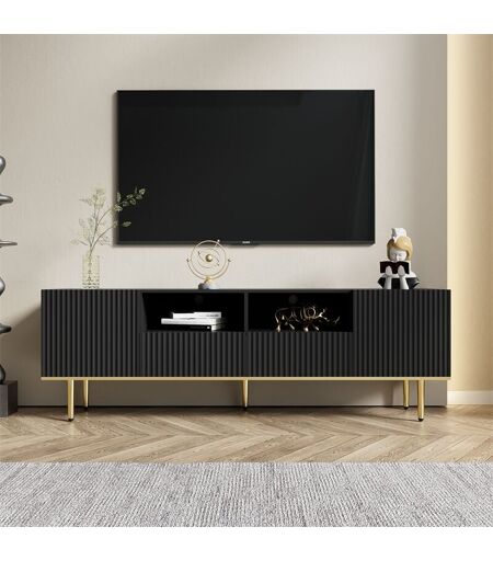 Fortuna Lai - Meuble tv 165x36x55cm, avec 2 portes, 2 tiroirs et 2 compartiments, pieds dorés et bord doré, Noir