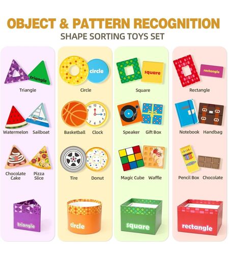 Beautiful Montessori stacking and sorting toy for little explorers: This wooden Montessori toy is a real treasure for curious children! It consists of 4 boxes of different shapes (triangle, circle, square, rectangle) and sizes, as well as 4 types of wooden blocks, 6 pieces per shape. Each block is carefully designed and inspired by everyday items, like a triangular pizza or round basketball. This educational toy combines fun and learning in a playful way!.Stacking game, sorting game and creative construction: Whether as a stacking game, where the boxes can be stacked by size to form a tower, or as a sorting game, where children associate the wooden blocks with the corresponding shapes, this motor skills toy offers a multitude of possibilities. In addition, children can use the blocks to build imaginative structures like towers, houses or bridges. This free play stimulates their creativity and develops their spatial thinking.EVERYDAY INSPIRED WOODEN TOYS - Learn by exploring: The realistic designs of wooden blocks make this educational toy truly unique. Children can discover and recognize everyday objects, such as a waffle or notebook, while having fun. This Montessori toy encourages imagination, supports language development and connects learning to real life.A safe and durable motor skills toy: This stacking and sorting toy is designed with care. The wooden blocks have smooth, rounded edges, and the paints used are non-toxic - perfect for little hands. Strong and durable, this toy accompanies children on all their adventures.The perfect gift for children: This versatile Montessori toy is ideal for a birthday, Christmas or a special surprise. It ensures hours of screen-free fun while stimulating creativity, motor skills and logical thinking. Whether as a stacking toy, sorting toy or for free-standing constructions, this wooden toy illuminates children's eyes and turns learning into a real pleasure!.Warning:Not suitable for children over 36 months.Warning:Not suitable for children under 3 years. For use under adult supervision ...