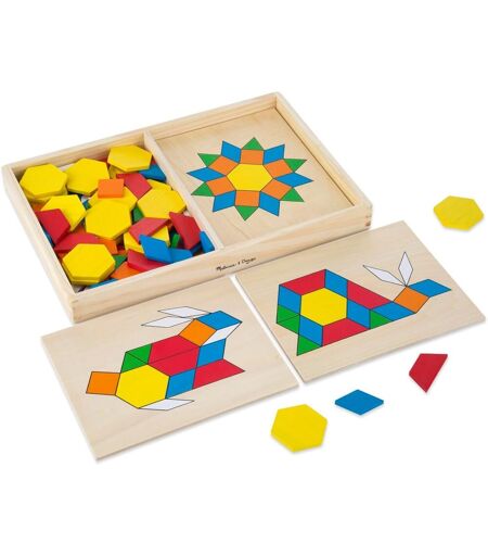 EDUCATIONAL SET OF WOODEN BLOCKS: The classic Melissa & Doug Pattern Blocks and Boards toy is a set of 120 wooden blocks in different shapes and colors, inspiring children to assemble colorful patterns on 5 boards.CLASSIC LEARNING ACTIVITY: Our set of blocks and pattern charts allows children to enjoy a classic math manipulation and learning activity. It is ideal for spatial awareness, color recognition, hand-eye coordination and problem solving.DOUBLE SIDED BOARD: The Melissa & Doug patterned block and board set includes double-sided boards that give kids even more creative play options. Kids can create linear patterns, sort blocks by color, count pieces, etc.GIFT FOR CHILDREN FROM 3 TO 6 YEARS OLD: The classic block and patterned board toy is an ideal gift for children aged 3-6. Add the Melissa & Doug 100 piece wooden block set to complete the convenient, screen-free gaming experience.'THE GOLD STANDARD OF CHILDPLAY' - For over 30 years, Melissa & Doug has created beautifully designed products that spark imagination and creativity that NBC News in the US has called ""the gold standard of early childhood play"". ...
