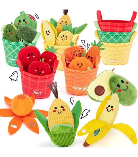 [Fruit and Vegetable Sensory Toys] The toy set includes 12 stuffed fruits and vegetables and 4 brightly colored baskets. Perfect for role play, sorting and sensory exploration for kids.[Fun and Educational Learning]Children learn to identify food and develop hand-eye coordination while having fun. Colorful baskets (orange, yellow, green, red) encourage color sorting and promote early learning of colors and shapes.[Multi-Sensory Stimulation]Different textures are designed on the surface of the toy to cultivate the sense of touch, as well as bells and rustling papers embedded in some fruits to stimulate the sense of hearing. Very suitable for baby's sensory awakening and cognitive development.[Safe Material]Unlike wooden or plastic toys, we use soft and hypoallergenic materials to ensure optimal safety and bring a pleasant touch experience for little hands.[Easy to carry]Fruit and vegetable toys can be easily put into the basket for storage, which is perfect for use at home or on the go. This fruit and vegetable plush toy is the best choice for 1 year old babies and also suitable as a gift for babies aged 6-12 months. ...