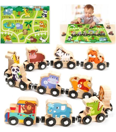 [Montessori Toys for 1 Year]Farm train game with animals features many adorable animals that children will love! Wooden educational toys are the ideal choice for boys preschool learning 2 3 4 years old. This wooden train features a locomotive and 10 cars with numbers 1-10 printed on one side and realistic animal designs on both sides. It also comes with a storage bag and play mat with colourful train rails printed on the farm stage.[Activity Educational Child 1 2 3 Years]Toys for boys 2 3 4 years. Wooden toys for children 1 year old are designed to help children develop their early cognitive abilities, such as identifying numbers and colors, counting and order numbers while playing. 1 year old baby toy They also develop manual skills, hand-eye coordination, logical thinking and fine motor skills through the free assembly of the train. Montessori toys for 2 year old kids.[Learn Fun and Exploring]Gifts for girls 1 2 3 years old. Colourful farm-themed play mat and easy to grip wooden wagons: it's Montessori toy ideal for early learning and fun. Toys for little girls allow you to play immersive role-playing games with 11 brightly colored animal figures. Small train moves around the map and parents tell interesting stories about each animal. First birthday for boys. Gift for 2 year old child.[Safe and high quality educational toy]Colorful storage bag, portable and convenient for outdoor play. It not only keeps the house tidy, but also cultivate good storage habits. Outdoor toys for children 1-2 years old. Train is made of high quality wood, with smooth surface and no burrs, to protect children's hands. The improved magnetic suction is more powerful, tightly connecting each section of the train. Toys for 2 year old boys.Ideal gifts for children 1, 2, 3, 4 years: wooden train is an ideal gift for girls and boys. Perfect birthday, Easter, Christmas, Children's Day, Thanksgiving, Valentine's Day, Halloween, award, visit. Give your son, daughter or grandson a fun and educational gift. Farm animals for children 2-4 years. Let them build longer trains to go on an adventure and let their imagination and creativity run wild. ...