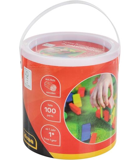 Building blocks for children from 1 year old in cheerful colours: blue, green, yellow and red.Contains 100 building blocks in the shapes: dice, cube, cylinder, prism (triangular), hemisphere and bridge.In the practical bucket with handle, the building blocks are quickly stored and can be easily transported.Made of wood and painted with saliva resistant water paint, making the toy totally safe for children.Playing promotes motor skills, creativity, spatial thinking and hand-eye coordination ...