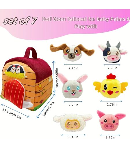 Farm Animal Barn Toy: The package includes 1 barn toy and 6 animals. The rattles inside each animal add a touch of surprise, accompanied by satisfying crinkling sounds. The side mirror of the barn becomes a portal for self-discovery, promoting self-awareness and sparking moments of joy.Sensory Exploration Experiences: The hide and seek surprise box offers a variety of activities (open, pull, stack) that help develop children's fine motor skills and hand-eye coordination. It is the ideal toy for toddlers to have imaginative play and farm simulation game by themselves, recognizing farm animals.Safe and soft: Baby soft toy is made from baby-friendly materials and does not contain small parts. Farm animals are filled with elastic PP cotton, soft and safe, machine washable, so baby can nibble and grab them safely.Parent-Child Interaction: Parents and babies play together during games or traveling, squeezing or shaking farm toys to interact with children. With these adorable soft toys, your baby will have hours of fun with you, which is ideal for stimulating the awakening and development of fine motor skills in a playful way.Practical and transportable: All animal stuffed animals are neatly packed in a large barn with a practical handle. The compact design makes it easy to carry for little hands. Make baby and toddler happy and save parents the worries of car trip, make the journey more enjoyable.Warning:Strangulation hazard. ...