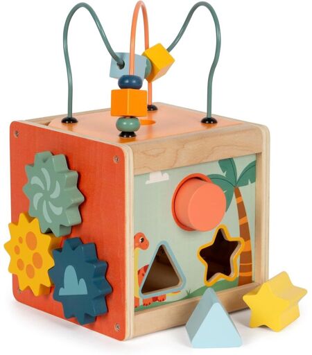 FSC 100%: This product is made entirely of wood from FSC certified forests.Motor cube with two motor loops, a set of shapes embedded, a sliding maze, a set of rotating shutters and gearwheels on five playable surfaces.Removable lid can be flipped into the cube to save space.Cute dinosaur designs stimulate imagination and invite storytelling.Approx. 15 x 15 x 25 cm.Warning:Toy inside. Adult supervision recommended ...