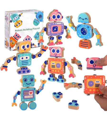Creative Toys for Kids This STEM toy set contains 28 pieces of wooden blocks. Kids can randomize head, arms, body and legs to create cool robots! Finished creations bring a sense of accomplishment.Durable and Safe to Use These kids blocks are made of solid wood with smoothed surface and rounded corners to ensure they are safe for children. The durable and vibrant water-based paint does not contain any harmful substances and is not easy to damage, it is also very easy to clean. The high-quality buttons are firmly fixed. You don't have to worry about your baby breaking it, it is very safe for children.Child-friendly snap-in connection design: these blocks assemble easily and perfectly with one click. All wooden building blocks can be interchanged between different bodies, helping children to think outside the box and build their own unique robot.FUN AND EDUCATIONAL We have carefully prepared a variety of different shapes and colors of pieces for children, hoping that children can exercise the ability to sort at the same time to improve hand-eye coordination and concentration. The simple and practical design also allows children to more clearly perceive the success of building blocks.PERFECT GIFT This interlocking wooden construction set is a perfect gift idea. It can be used as Montessori educational toy, also can be an educational toy and a learning toy. This disassembly toy set can keep children away from technological screens and promote close relationships with relatives and friends. Suitable for Christmas, New Year, birthday gifts for 3 4 5 6 year old boys and girls. ...