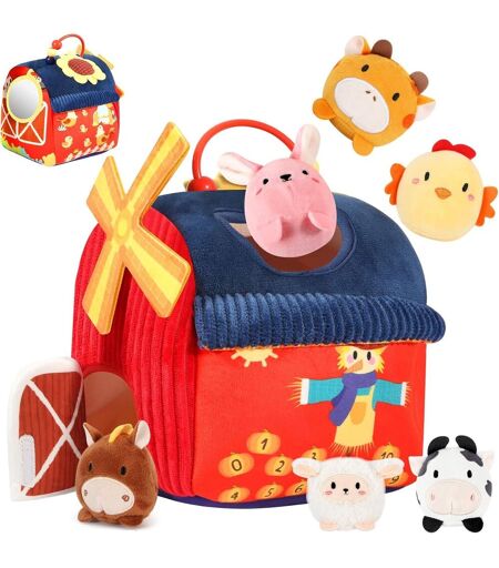 Baby Toy 6 Months Farm Animals in Plush,Sensory Farm Barn with Animal Plush,Bell & Mirror,Montessori Sensory Toy 0-6 Months,Montessori Sensory Toy