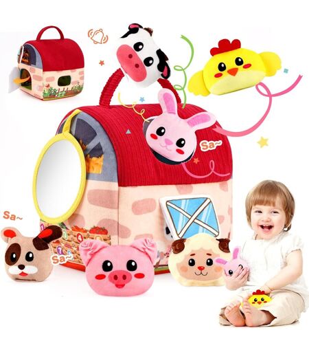 Baby Toy 6-12-18-24 Months-Sensory Farm Barn with Animal Plush,Bell & Mirror-Montessori Toy for Fine Motor Skills and Development 1-2 Years