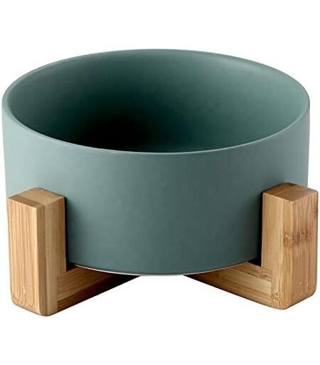 THE EXCLUSIVE BAMBOO HOLDER - The base of the bowl has been made of durable bamboo and cannot be easily moved or knocked over by pets when eating thus keep the floor always clean and tidy. We have applied 4 silicone pads to the base to prevent the structure from slipping on the floor while maintaining the grip and laying on any surface.Safe and Healthy Material Our handmade pet bowls are made of thick porcelain ceramic, lead and cadmium free. Veterinarians recommend a ceramic bowl as it is cleaner and bacteria free. Non-toxic, harmless, odorless and durable material protects the health of your pets.EASY TO WASH - Easy to clean and hygienic with a smooth surface that provides greater convenience for washing. High temperature resistant, they can be washed in the dishwasher for even easier cleaning. Because we know how important the health of your pets is to you. In addition, it can also be used in the microwave, you gain.MODERN DESIGN - Thanks to their minimalist design and neutral colors, the bamboo stand adapts to any decor and room where your dog or cat will eat. The proper height helps ingest food and water, emptying a healthy eating posture while protecting your pet's cervical spine. Besides, the raised platform is especially suitable for an elderly pet who might have trouble bending to eat.Warranty Policy: 100% satisfaction guarantee and quality customer service. With a 90-day product warranty, in case of damage, please feel free to contact us. We will reply you in time.DIMENSIONS - Most pets have health problems when eating, such as acne on chin and dirty face due to the wrong feeding bowl. It is necessary to choose a healthy and correct bowl, which is why we thought of 3 different sizes: 5"" (for cats and small dogs), 6.1"" (for medium dogs) and 8.1"" (for large dogs). Choose the size that suits you and give your pet a gift. ...