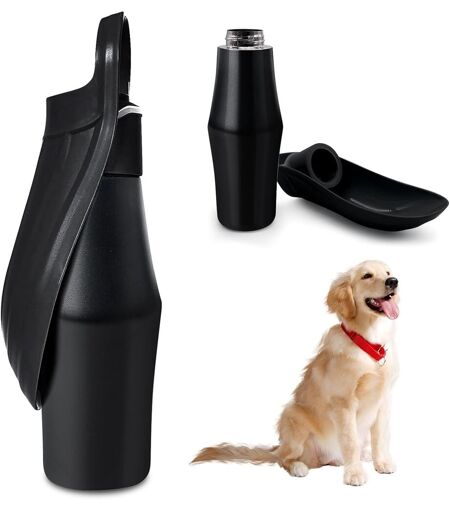 FOOD SAFE & DURABLE MATERIAL The dog water bottle is a dog water bottle made of polypropylene and stainless steel that ensures the health of our dogs. The soft and spacious design of the case provides optimal comfort for our furry friends.Innovative 2-in-1 design: the dog water bottle is simply folded over the lid and shaped like a water bowl. The quick release button allows you to control the water flow or let it flow back. Save unused water.Leak-proof The dog water bottle is equipped with a silicone seal that fits tightly to the bottle neck and prevents leakage. Even during outdoor activities or car rides, you don't have to worry about water leakage, wet backpacks or cars.PORTABLE & LIGHTWEIGHT The portable design of the dog water bottle is compact and comes with a shoulder strap. You can easily take this dog bottle anywhere. The dog water bottle can be attached to your backpack, dog harness, wrist, stroller or glove box. Never worry about your dog thirsty outside.IDEAL CHOICE FOR OUTDOOR USE: When walking your dog, you should always provide enough water. This portable dog water bottle is the best choice for travel and walking. Enjoy safe and fun outdoor activities with your pet. The dog water bottle holds 750ml of water and is suitable for small, medium and large dogs. ...