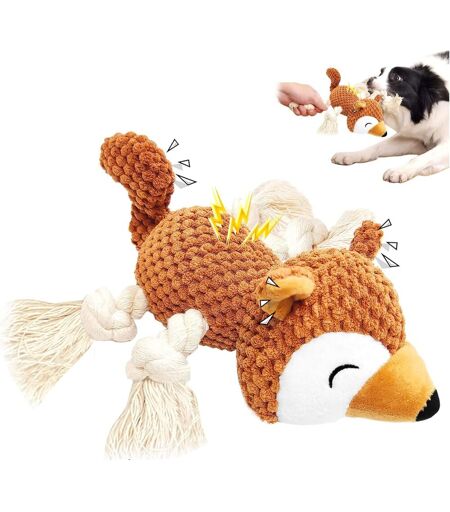 SOFT AND DURABLE FABRIC The dog plush toy is mainly made of corduroy, which has a comfortable touch and good durability. The soft surface does not damage your dog's gums. The interior is padded with soft cotton. Waterproof layer effectively slows down the flow of saliva in dog toys. Plush dog toys are suitable for small, medium and large dogs.Squeaky toys for dogs: The dog toy comes with a squeaker in the body and the crumpled paper in the tail, which attracts your dogs' attention and increases their interest in dog toy. The sound can keep your dogs busy in toys and keep them away from boredom, and will help the interactive training between you and your dogs.ROPE FEET: The dog comforter comes with movable knotted rope feet. They not only increase durability, but also increase their interest in dog toys. Dog plush toys can be used as tug toys and fetch toys. Your dogs will reap physical exercise, mental stimulation, bonding with you, cleaning teeth. A deserved dog gift for your dogs.WARM TIPS: This toy is not a chew toy. Dog comforters are not indestructible and there is a squeaker inside, so watch your dog's play. Once your dog starts to break the toy, stop his behavior immediately. If you see tears in the seams or padding coming out, it's time to keep the toy away from your dog.CLEANING: Can be machine washed. Start by brushing any dry dirt before disinfecting them in the dishwasher, if you have one. If you don't have a dishwasher, clean them in your washing machine using a warm cycle. Then let the plush toys air dry. ...