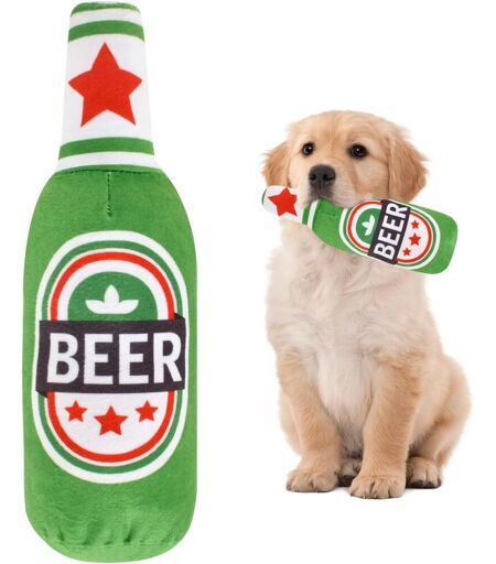 High-quality material: our dog toys are made of high-quality plush. The material is absolutely pet friendly, double-layer composite fabric, double-layer seams, the quality of the material ensures a long service life of the toy, even with regular use. Very soft, safe, healthy material, washable. gums when dogs grind their teeth.¿[Squeaky Toy]This dog toy has a built-in squeaker that will squeak when pets bite it. When the dog is alone at home, dogs squeaky toys can be used to relieve stress and loneliness. Not only do they prevent damage to furniture, clothes, etc., but also allow your dog to be healthy and have a happy mood.¿[Teeth Cleaning]The squeaky bottle dog toy not only cleans your dog's teeth from stains, but also reduces plaque and tartar build-up, keeping your dog's mouth healthy. It also relieves the stress of teething and puppy chewing bites, keeping your dog happy and healthy.¿[Unique Design]The dog toys are designed in the shape of beer bottles, simulated appearance makes dogs quickly fall in love with plush dog toys, perfect for chewing, playing and pulling, sound bubbles are built into each bottle toy that make sounds when pressed or bited, which can stimulate your dog's interest in the toy.¿[Wonderful Gift]The dog wine bottle plush toy is an and funny birthday gift, and dogs love the wine bottle design to provide daily entertainment for your pet. This toy can also be used as a reward during workouts to encourage good behavior. ...