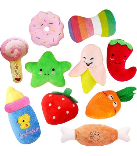 [10 Packs Puppy Toys] 10 packs of squeaky plush dog toys, including: pink donut, green star, red pepper, banana, duckling, chicken leg, carrot, blue bottle, colorful bones, watermelon. Their shape and color design is what dogs love. And dogs are very happy to play with them for a long time.[Safe and High Quality] The dog toys are made of high quality plush and cotton. So these dog toys are very safe and reliable. Your dog needs to chew, regardless of its type. That is their nature. To love them is to liberate their nature.[Ideal for Dental Health] Protect dog's teeth and health. The dog plush toy can not only chew and play, but also clean the dog's teeth. Thus protecting the health of the dog's teeth. These dog toys are perfect gifts for dogs.[Design for small dogs] Squeaky dog toys for small and medium children. All dog toys have squeakers, and they can constantly attract the dog's attention while playing with the dog. These toys are only suitable for puppies and medium dogs.[Note] Dog toys cannot be eaten. If your dog destroys the toy and eats the stuffing by mistake, please take care of it in time. At the same time, we suggest the owner to pay attention to the damage of the puppy toy in time. ...
