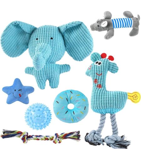 [Safe & Non-Toxic]Our pet chew toys are made of high-quality plush material, which looks very soft and durable, all chew toys are non-toxic, promote healthy dental cleaning, massage gums and prevent destructive chewing habits. Perfect for small and medium dogs to play interactive games, keep your puppy happy and engaged.[7 PCS Pet Toys Set]7 pieces of cute puppy toys, including 5 squeaky plush toys, 1 strong rope toy, 1 interactive ball. These durable puppy toys are a favorite of puppies or young dogs. Ideal for puppies to play interactive games, your dog will have fun whether you participate in the game or not, helping them stay happy and healthy.[Exercise Chewing Function]The dog toys of the set are soft and durable, will not hurt the dog's teeth or gums, can well help the dog perform its chewing function and relieve stress, can also clean the dog's teeth, promote healthy dental cleaning, prevent the dog's teeth from yellowing after chewing, massage gums and maintain the healthy chewing behavior of the chio! T.[Intellectual Interactive Toys]Our plush dog toys are soft and durable. Play tugging, throwing and fetching games with your dog using a variety of rope toys, which can not only effectively train your dog's attention, but also promote relationships with your pet. The built-in squeak of plush dog toys will attract the puppy's attention and no longer destroy furniture.[Great Gift]This puppy toys set is made of safe and non-toxic materials, perfect for puppies, and each dog toy is unique. These toys can keep your dog happy and relieve boredom and anxiety when you are not at home. Dog toys are suitable for fun indoor activities and outdoor play with your dog. These puppy toys are also great gifts for pet loving family friends! ...